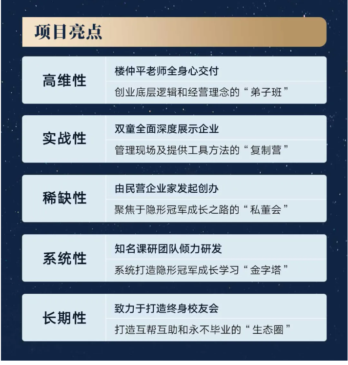 經(jīng)過(guò)前兩期的交付、打磨,“隱形冠軍樓仲平思享會(huì)”已進(jìn)化為一個(gè)集高維性、實(shí)戰(zhàn)性、稀缺性、系統(tǒng)性和長(zhǎng)期性于一體的高品質(zhì)商業(yè)課程。