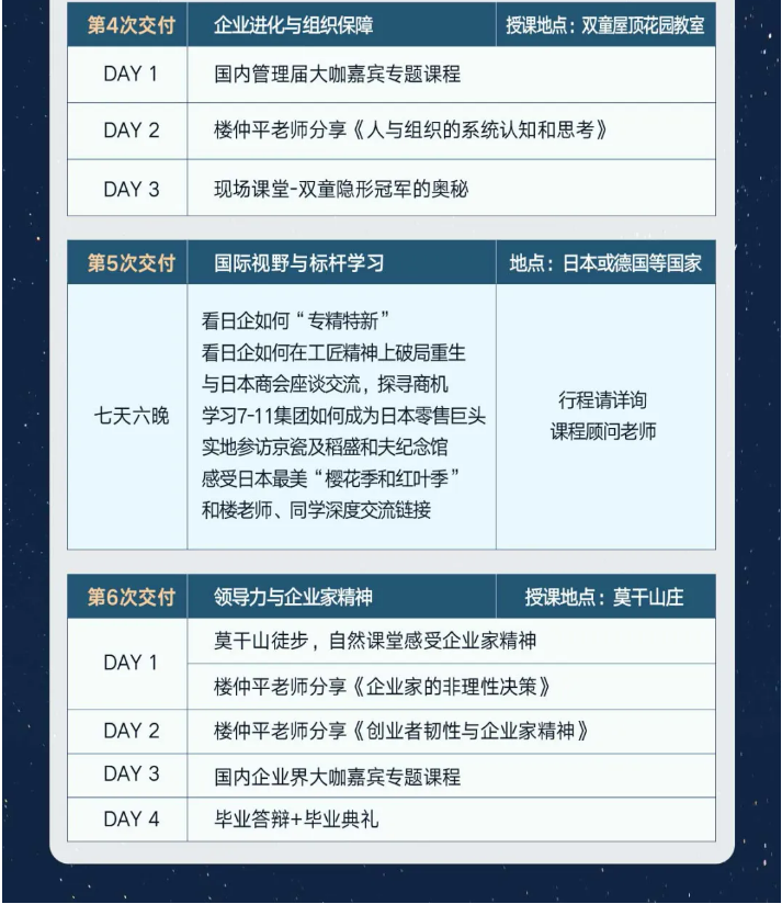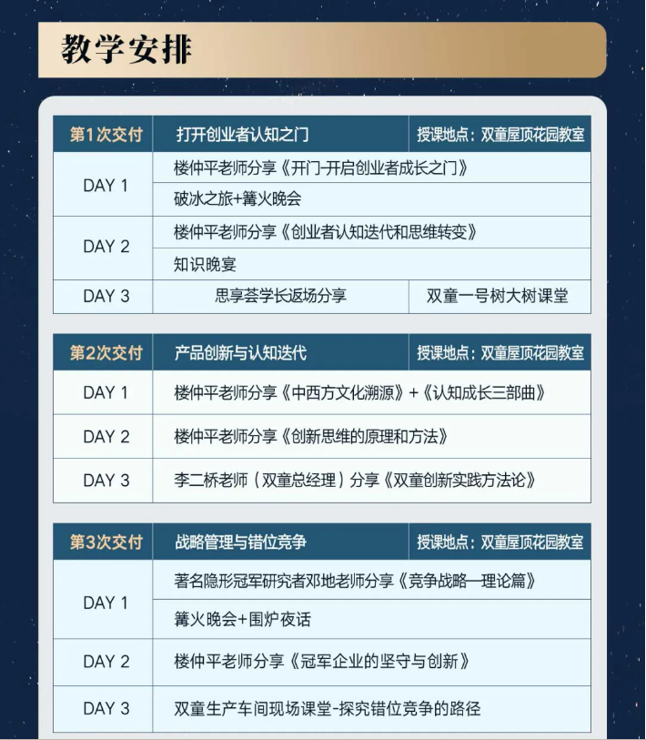 一年陪跑、7大模塊,樓老師將花費(fèi)24天時(shí)間深度陪伴學(xué)員成長(zhǎng),圍繞《打開(kāi)創(chuàng)業(yè)者認(rèn)知之門(mén)》、《產(chǎn)品創(chuàng)新與認(rèn)知迭代》、《戰(zhàn)略管理與錯(cuò)位競(jìng)爭(zhēng)》、《企業(yè)進(jìn)化與組織保障》、《國(guó)際視野與標(biāo)桿學(xué)習(xí)》、《領(lǐng)導(dǎo)力與企業(yè)家精神》等6大主題內(nèi)容和同學(xué)們做深度地閉門(mén)分享。