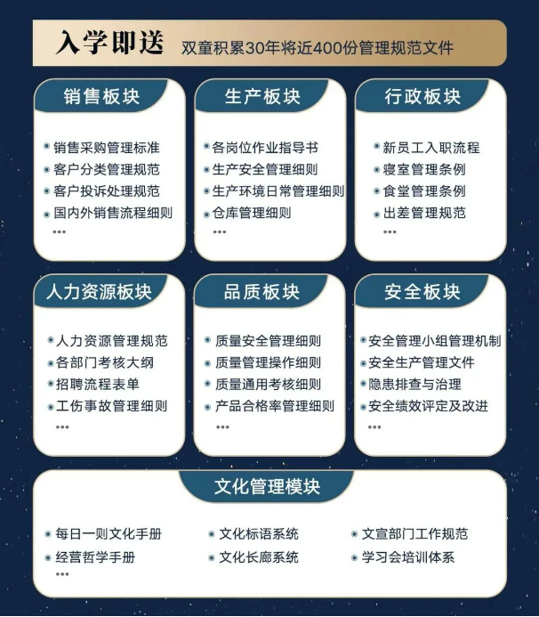 所以,入學(xué)“隱形冠軍樓仲平思享會(huì)”之后,項(xiàng)目組會(huì)將“雙童”積累了30年、包含了銷(xiāo)售、生產(chǎn)、行政、人類(lèi)資源、品質(zhì)、安全和文化管理7大板塊,將近400分管理規(guī)范文件,全部打包給學(xué)員,幫助學(xué)員企業(yè)能夠全面借鑒雙童管理經(jīng)驗(yàn)、少走彎路、少采坑!