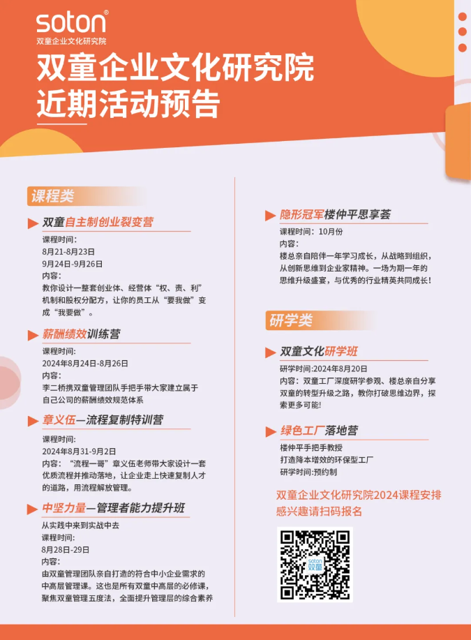 如果你也對(duì)“雙童”充滿好奇,也想改變企業(yè)困局現(xiàn)狀,也想要學(xué)習(xí)“專精特新”企業(yè)的管理經(jīng)營(yíng)方法,歡迎咨詢報(bào)名“雙童”課程! 掃碼咨詢報(bào)名