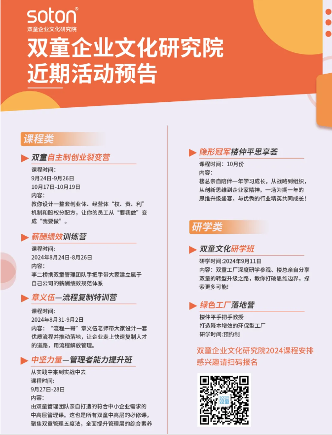 如果你也對“雙童”充滿好奇,也想賦能團隊共同成長,歡迎走進9月11日【雙童文化研學(xué)班】,與上百位優(yōu)秀的創(chuàng)業(yè)者一起學(xué)習(xí)!少量名額,歡迎咨詢鎖定!