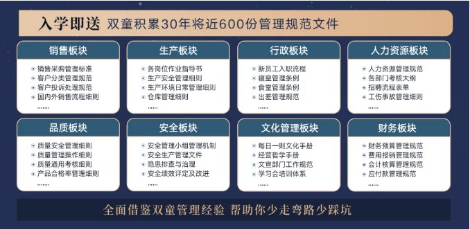 所以,入學“隱形冠軍樓仲平思享薈”之后,項目組會將“雙童”積累了30年、包含了銷售、生產(chǎn)、行政、人類資源、品質(zhì)、安全和文化管理7大板塊,將近600分管理規(guī)范文件,全部打包給學員,幫助學員企業(yè)能夠全面借鑒雙童管理經(jīng)驗、少走彎路、少踩坑!