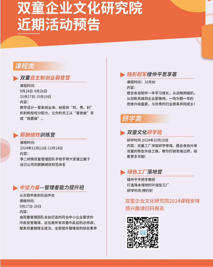 如果你也對“雙童”充滿好奇,也想賦能團(tuán)隊(duì)共同成長,歡迎走進(jìn)10月10日【雙童文化研學(xué)班】,與上百位優(yōu)秀的創(chuàng)業(yè)者一起學(xué)習(xí)!少量名額,歡迎咨詢鎖定!