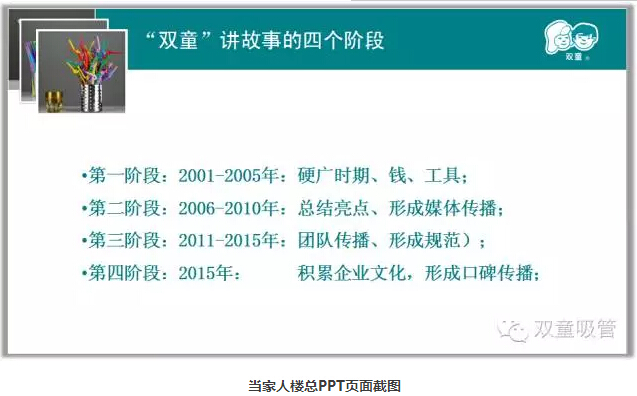 而“雙童”在品牌推廣的過程中,其實(shí)也是分階段的。從硬廣時(shí)期,每年投入200多萬元做廣告,到后來的塑造差異化亮點(diǎn),引導(dǎo)媒體給“雙童”講故事,再到成立文宣部門,形成團(tuán)隊(duì)“講故事”,最后達(dá)到形成企業(yè)文化,形成口碑傳播。這是一條漫長(zhǎng)的道路,需要“雙童”人持之以恒的堅(jiān)持和努力!