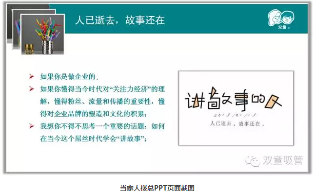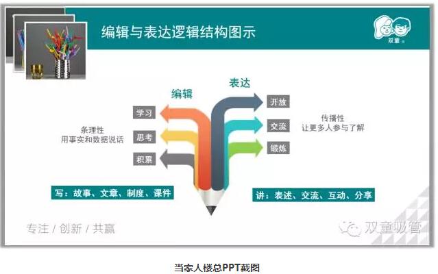 在講課過程中,當(dāng)家人樓總也重點(diǎn)闡述了他在偉雅老師和指間柔沙老師影響下,培育“雙童”文宣團(tuán)隊(duì)的過程。從最開始的不斷失敗,到手把手把吸管妞帶在身邊培養(yǎng),再到慢慢形成五人編制的文宣團(tuán)隊(duì),中間可謂是一波三折。