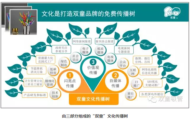 上邊則是政府、媒體關(guān)注的價(jià)值觀傳播。三大部分組成了“雙童”的文化傳播樹!而這棵樹也清晰系統(tǒng)地說明了“雙童”是如何傳播“故事”、塑造品牌的!