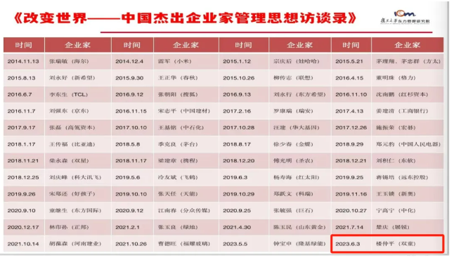 自2014年《改變世界》項目啟動,上海第一財經(jīng)頻道還同步推出了同名系列專題片訪談,近10年時間共采訪了50位中國各行各業(yè)影響力頗深的企業(yè)家,通過深度訪談,薈聚中國式管理的思想精粹,向世界管理論壇傳遞中國的聲音!