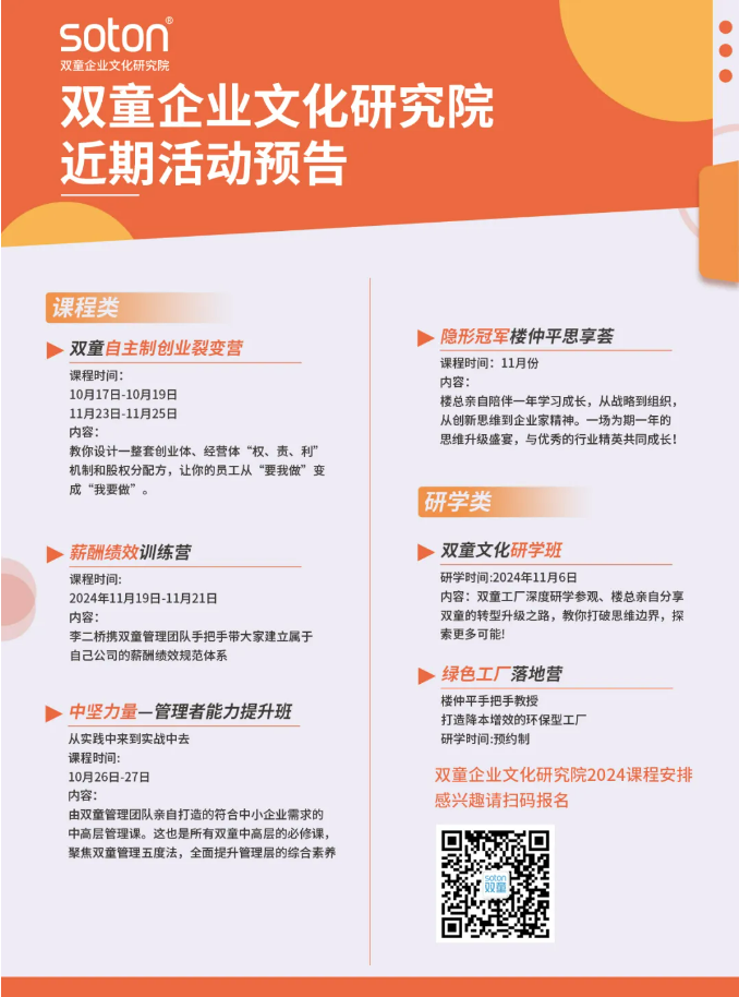 從樓總的分享中,我們能清晰地感知到,他一直在尋求破界、創(chuàng)新,每當企業(yè)趨于穩(wěn)定時,他就會扮演“攪局者”的角色,打破現(xiàn)有的平衡。也正是創(chuàng)始人這種“于無聲處聽驚雷”的未雨綢繆,才能讓雙童在每次危機來臨時,都能成功“闖關(guān)”,穿越一個個成長周期!