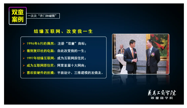 前文所述的雙童先后三次“開(kāi)門”的經(jīng)歷只是《雙童文化研學(xué)班》創(chuàng)始人樓仲平主題課程分享的精彩片段。分享介紹后,樓總還將以問(wèn)答互動(dòng)的形式為學(xué)員們解答參觀過(guò)程中疑惑、或者企業(yè)發(fā)展中遇到的問(wèn)題,讓大家在研學(xué)活動(dòng)中避免走馬觀花,真正找到“雙童”經(jīng)營(yíng)過(guò)程中的科學(xué)管理邏輯,實(shí)現(xiàn)創(chuàng)業(yè)思維的升階!