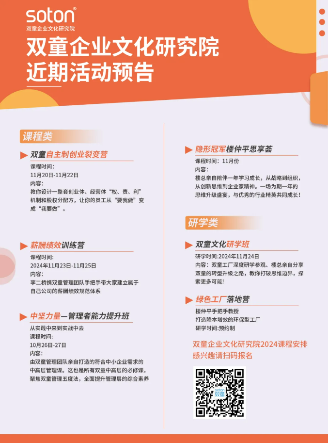 經(jīng)久耐用的食堂餐桌是“雙童”長期主義的代表走過百米文化長廊, 廣州市委統(tǒng)戰(zhàn)部領(lǐng)導一行通過文字和圖片見證了“雙童”不同階段的成長。在講到雙童“家文化”的時候,“雙童”的組織關(guān)系如何規(guī)避血緣關(guān)系、保持企業(yè)內(nèi)部的清廉成了領(lǐng)導們好奇的地方。創(chuàng)始人樓仲平告訴大家,正是由于“家文化”的特殊性,“雙童”的組織關(guān)系特別注意強化規(guī)則關(guān)系、契約關(guān)系、團隊關(guān)系和社會關(guān)系!同時在2011年明確提出組織關(guān)系的三原則:子女不接班、有血緣關(guān)系的直系親屬不得進入管理層、可以是家族企業(yè)但不能成為家里的企業(yè)。