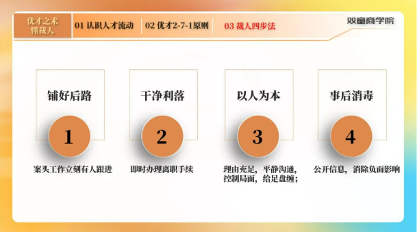 但是,程老師告訴大家一旦選擇優(yōu)才,必須要提前做好接頭工作,并且做好善后工作,消除負(fù)面影響,具體的裁人步驟可分為:鋪好后路-干凈利落-以人為本-事后消毒,將消極影響降到最低!