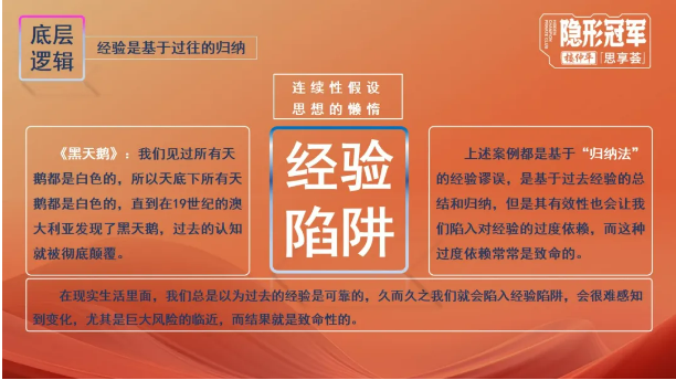 所以樓老師在課上,選用經(jīng)典的“黑天鵝”和“感恩節(jié)的火雞”作為教學(xué)案例,讓同學(xué)們明確認(rèn)識(shí)到:經(jīng)驗(yàn)的底層邏輯是基于過(guò)往的歸納,但世界是“非連續(xù)性”的,對(duì)過(guò)去的歸納總結(jié)對(duì)未來(lái)未必有效,想象力需要反叛精神。