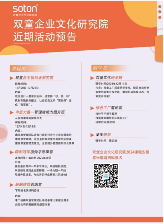 如果你也對(duì)“雙童”充滿好奇,也想賦能團(tuán)隊(duì)共同成長(zhǎng),歡迎走進(jìn)12月11日【雙童文化研學(xué)班】,與上百位優(yōu)秀的創(chuàng)業(yè)者一起學(xué)習(xí)!少量名額,歡迎咨詢鎖定!
