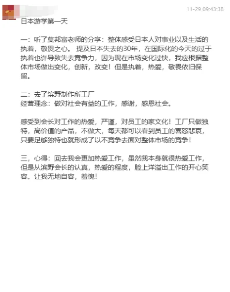 這一切不可思議現(xiàn)象的背后,均是濱野慶一會長在背后推動。他自詡是一位會給員工“畫餅”的老板,他說:“對我們公司來說,我找的員工不是工人,而是有共同理念的合作伙伴。”他會用各種方法讓員工發(fā)揮主觀能動性,創(chuàng)造美好環(huán)境讓年輕員工愿意向往制造業(yè)。