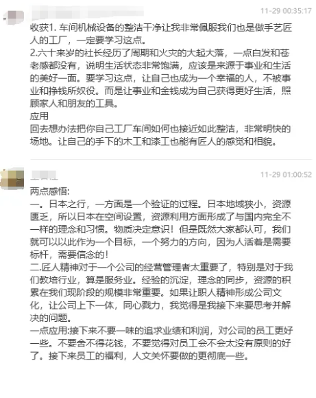 所以,在第一天的研學(xué)結(jié)束之后,同學(xué)們不僅收獲了很多關(guān)于產(chǎn)品創(chuàng)新、精細(xì)化管理等企業(yè)經(jīng)營的新靈感,對自身企業(yè)未來的經(jīng)營方向也有了不一樣的感觸:
