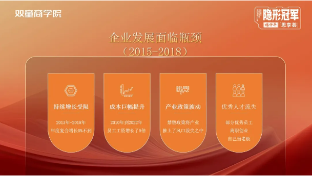 2015-2018年,雙童的發(fā)展進(jìn)入了瓶頸期:持續(xù)增長受限,成本大幅度提升,產(chǎn)業(yè)政策造成了很大波動,優(yōu)秀人才的也開始流失。這些都是亟待解決的難題。