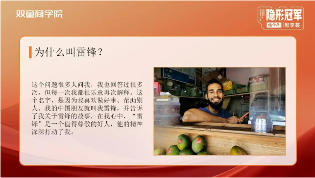 追溯“雷鋒”這個(gè)名字的由來,背后還藏著一段饒有趣味的故事:2015年,他跟隨兩位舅舅來到中國義烏,利用語言優(yōu)勢進(jìn)入一家外貿(mào)企業(yè)任職,主要負(fù)責(zé)倉庫裝貨與發(fā)貨等環(huán)節(jié)。初入職場時(shí),天生樂于助人的他,無論對(duì)方是否相識(shí),總是愿意伸出援手,即便是提供些微的幫助。于是,領(lǐng)導(dǎo)同事們開始戲稱他為“埃及雷鋒”。