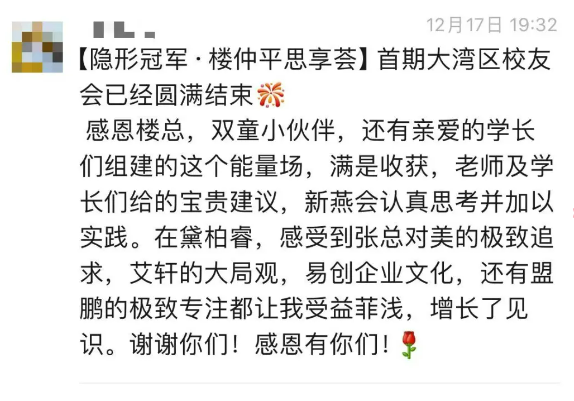 一直以來(lái),樓仲平【思享薈】最珍貴的東西除了知識(shí),還有一個(gè)最讓人動(dòng)容的東西就是校友們的真情!每一次相聚,都像是闊別重逢的老友,無(wú)論是在雙童,還是在大灣區(qū)校友會(huì)晚宴上,大家都能把酒言歡,都有說(shuō)不盡的言語(yǔ)!