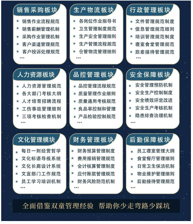 所以,入學(xué)“隱形冠軍樓仲平思享薈”之后,項(xiàng)目組會(huì)將“雙童”積累了30年、包含了銷(xiāo)售、生產(chǎn)、行政、人力資源、品控、安全、文化管理、財(cái)務(wù)和后勤等9大板塊,近600份管理規(guī)范文件,全部打包給學(xué)員,幫助學(xué)員企業(yè)能夠全面借鑒雙童管理經(jīng)驗(yàn)、少走彎路、少踩坑!