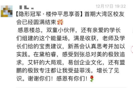 本次大灣區(qū)校友會(huì)活動(dòng)圓滿落幕,隱形冠軍樓仲平思享薈也將不定期舉辦川渝地區(qū)、江浙地區(qū)等校友會(huì)活動(dòng),通過走進(jìn)學(xué)員企業(yè)研學(xué),加深相互鏈接,將這份源自樓仲平“弟子班”的情誼與溫暖永久地延續(xù)下去!