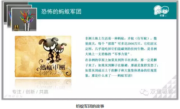 游戲結(jié)束,課程也正式開始啦!妞通過兩個(gè)小故事和我們分享了團(tuán)隊(duì)精神,在非洲的大地上有一支恐怖的“軍事力量”——螞蟻軍團(tuán)!成百上千的獅子和大象見到他們就會集體逃命,他們經(jīng)過的地方會寸草不生。一只螞蟻的力量很小,可成千上萬只螞蟻的力量卻是無窮大呀!