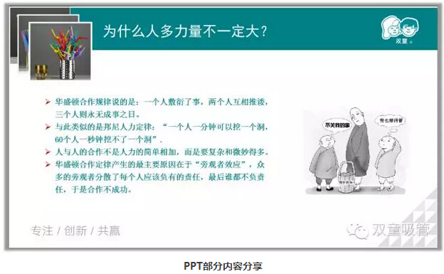為什么人多不一定力量大呢? 德國科學(xué)家瑞格爾曼的拉繩實(shí)驗(yàn):參與測試者被分成四組,每組人數(shù)不同。測量的結(jié)果顯示人越多,反而拉力總和越小。可見:在群體組織中,并不必然得出1+1>2的結(jié)果,而是1+1<2。這也是旁觀者效應(yīng),一個(gè)人敷衍了事,兩個(gè)人互相推諉,三個(gè)人則永無成事之日。也就有了三個(gè)和尚沒水喝的故事!