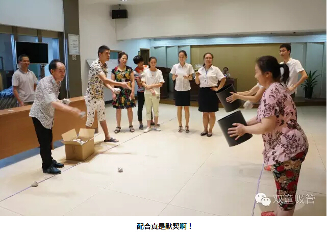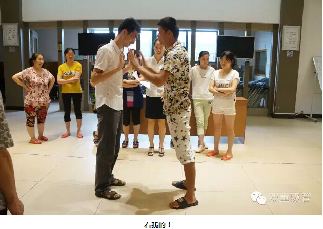 “太極推推樂?”這個(gè)游戲是讓每組夫妻派出一人應(yīng)戰(zhàn)。對(duì)抗的兩人面對(duì)面站立,雙方相互之間輕推對(duì)方的手掌,對(duì)方的腳最先離開原來站立的點(diǎn),誰就輸了??炜?!我們的妻子們可賣力啦,丈夫們也毫不示弱,場(chǎng)面可真是熱鬧呀!