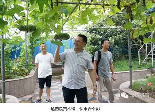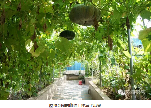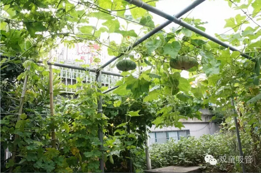 這樣的場(chǎng)景總會(huì)吸引來“雙童”參觀的朋友們駐足觀賞,拍照留念,贊嘆屋頂菜園的瓜果!