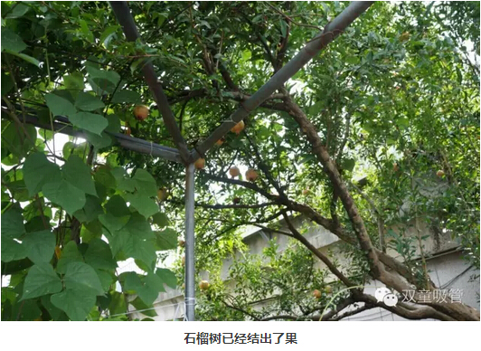 一旁石榴樹也來湊熱鬧!因?yàn)橛兄?span style="font-family:Calibri;">1.5米厚的土層滋養(yǎng),樓頂?shù)倪@一株石榴樹也長(zhǎng)出了果實(shí),再過不久,“雙童”的吃貨們又有???!