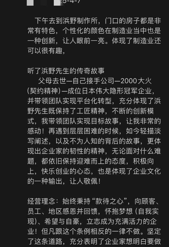 所以浜野慶一會長特別提出了這樣的經(jīng)營理念:“常懷 ‘款待之心’,感恩回報顧客、員工和當(dāng)?shù)兀蔀橐患矣袎粝?,有自我,有前途,打造充滿自豪感與活力的企業(yè)!”。