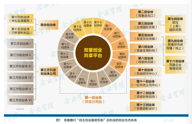 推行“自主創(chuàng)業(yè)裂變機(jī)制”五年來,雙童已孵化出16家創(chuàng)業(yè)體公司,形成以主業(yè)務(wù)板塊為核心的雙童創(chuàng)業(yè)生態(tài)(見圖1),40多位員工成為創(chuàng)業(yè)體公司股東,完成從“打工人”到“創(chuàng)業(yè)老板”的華麗轉(zhuǎn)身,實(shí)現(xiàn)企業(yè)與員工共同富裕。同時(shí),雙童從一家實(shí)體制造企業(yè),轉(zhuǎn)型為工貿(mào)一體、孵化裂變的平臺(tái)型企業(yè)。由于新的創(chuàng)業(yè)體公司也可以通過拆分裂變出經(jīng)營體,目前雙童創(chuàng)業(yè)共享平臺(tái)已經(jīng)合計(jì)裂變出26個(gè)經(jīng)營體。