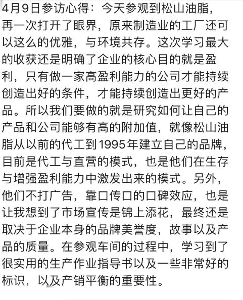 這次參觀松山油脂的富士山工廠,也讓同學(xué)們深刻體會(huì)到了松山油脂對(duì)產(chǎn)品制造的嚴(yán)謹(jǐn)態(tài)度,同時(shí)更加深入了解日本傳統(tǒng)日化制造業(yè)的發(fā)展和現(xiàn)代管理,學(xué)習(xí)如何在堅(jiān)守傳統(tǒng)的同時(shí),實(shí)現(xiàn)品牌化與市場(chǎng)化發(fā)展。