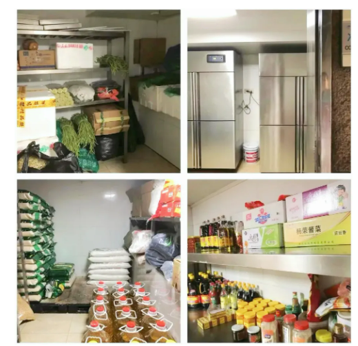 其中采購入庫的魚、肉等易腐爛變質(zhì)的葷菜必須分區(qū)妥善保存在冰箱中,新鮮蔬菜與米、面等主食原料分開存放;除了常規(guī)的食材分開存放外,食用油、大米、面粉、面條、調(diào)味料等食材消耗品,進行分類、分架、隔墻、離地存放。