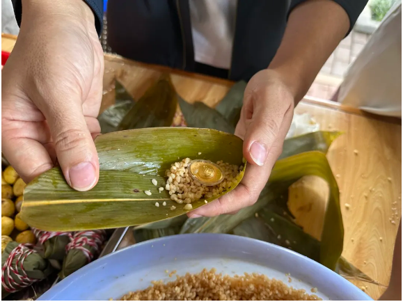 重頭戲來啦,黃金元寶餡料已就位!大家一起目睹它們被包進(jìn)香糯米里,可惜時(shí)間太短,完全記不住這幾個(gè)粽子的外貌特征就已經(jīng)要開始煮了。