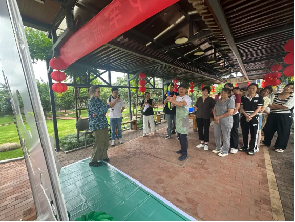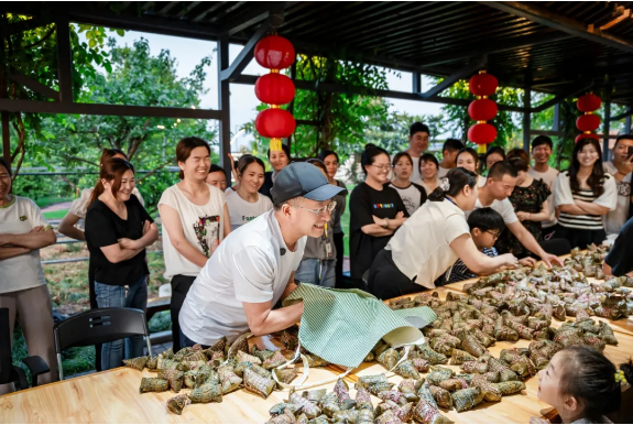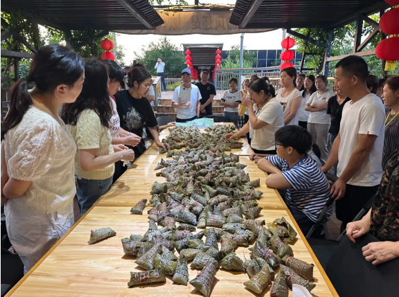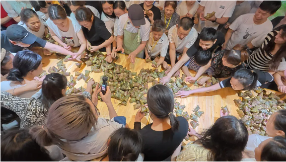 由于各個(gè)崗位的年輕人都沒有親自做過粽子,手忙腳亂地做出來的粽子始終不成型。樓總便趕忙邀請了他的幾位親戚過來做“指導(dǎo)老師”,現(xiàn)場手把手傳承包粽子手藝。