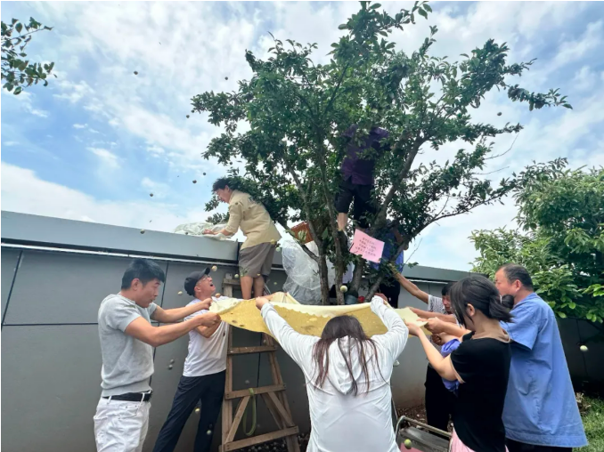 轉(zhuǎn)戰(zhàn)一株臨墻李子樹,我們搬來了梯子采摘,樓總介紹道:“雙童的水果一旦熟了之后,我們就會提醒員工果子已成熟。不折枝,不爬樹,只在樹下品嘗。為什么不讓爬樹?因?yàn)榕虏话踩?。你一個人來爬樹,就怕出現(xiàn)安全問題,人多的時候爬樹也能確保安全?!?/span>借助工具,攀上枝頭,只為得到那一抹甜蜜。這一棵樹臨墻而生,又長的太高,實(shí)在是不好夠到,但也不能這么白白放棄呀,那么好的李,于是大家拿來布,兜在樹下,搖晃樹干,天空下了一場李子雨。大家一邊被“雨”砸得嗷嗷叫,但是又一邊快樂地大笑。沒一會兒的功夫,十幾個果筐早已被青紅的李子塞得滿滿當(dāng)當(dāng),陽光透過枝葉在果堆上灑下斑駁的光暈,仿佛給這場豐收節(jié)奏上了華彩的樂章。