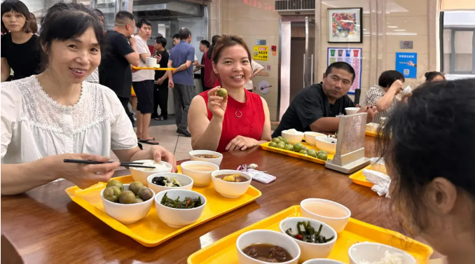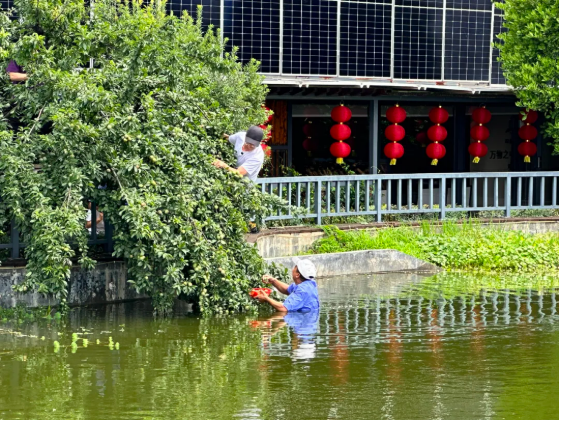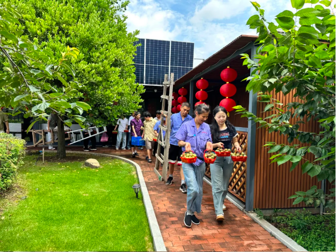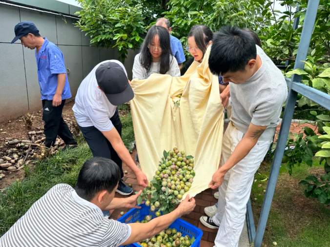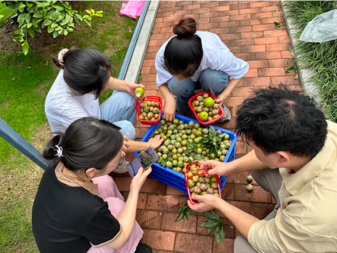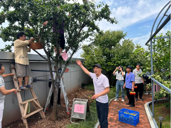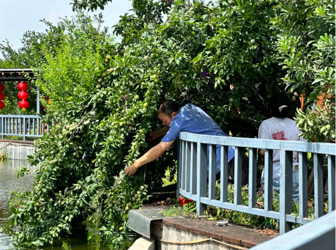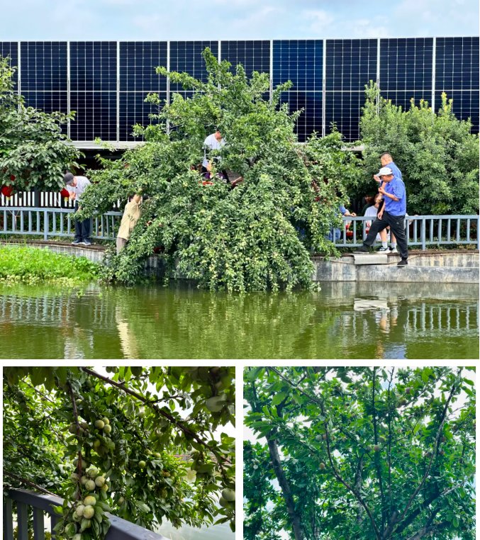 在采摘的過程中,發(fā)現(xiàn)一棵李子樹臨水生長,很多大果、紅果都在池塘那邊。見此,大家都犯了難,猶豫要不要放棄這棵樹上的果實(shí)。突然,一聲“讓我來”奪去了大家的注意力,一位員工自告奮勇,他嘿嘿一笑,說“這里水又不深,我下去一趟就是了。這么好的果子,不摘不就浪費(fèi)掉了?”轉(zhuǎn)即,他拿來了下水的膠褲和膠鞋,扶著欄桿,小心地下了水,麻溜地摘了起來。不多時,李子又摘了一籮筐,他高興地舉起籃子,臉上洋溢著興奮的笑容。生態(tài)園里此起彼伏的歡呼聲化作豐收的樂章。不少員工捧著剛摘的“糖心李”現(xiàn)場開吃:“真的好甜,小的李子比大的還有味道呢!”有些員工干脆現(xiàn)采現(xiàn)吃,和大家邊吃邊嘮嗑:“這可比超市買的香多了,又無污染無公害的!”