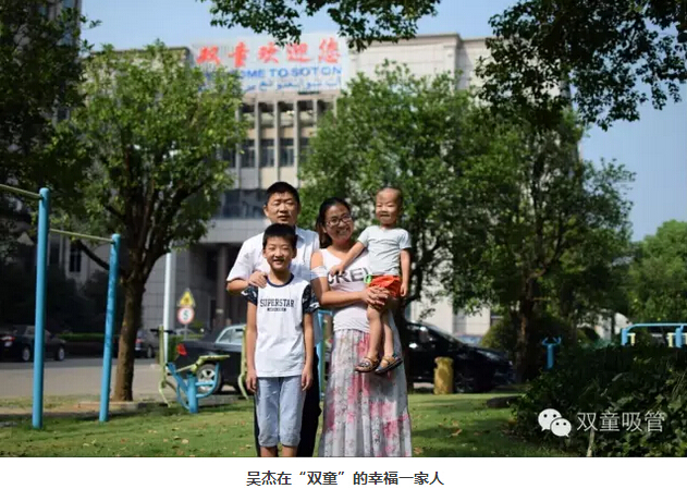 事業(yè)蒸蒸日上的同時(shí),吳杰還有一個(gè)幸福的小家庭。2009年,吳杰把老婆呂二燕也接來(lái)了“雙童”,在藝術(shù)吸管崗位工作。2012年,由于要照顧孩子,老婆呂二燕辭去了工作在家相夫教子。同年,吳杰又喜得一子,一家四口住在公司安排的行政套房?jī)?nèi),一家子真正把家安在了“雙童”。