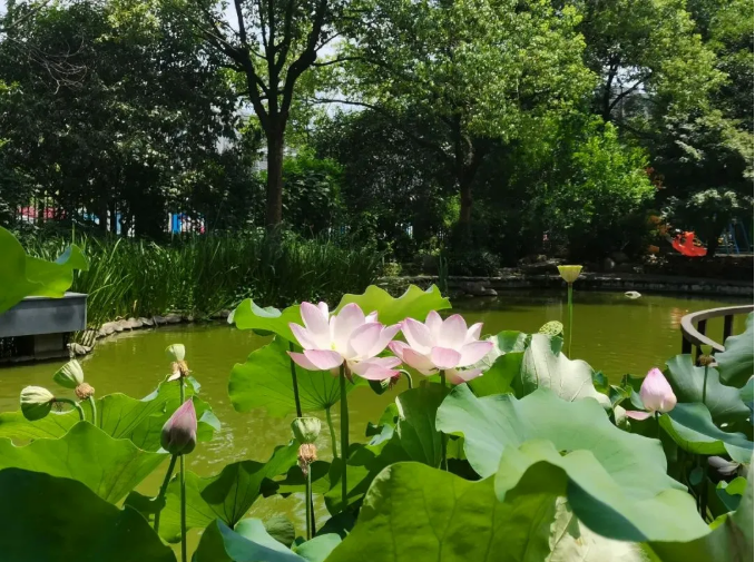 下班時分,總能看到同事們三三兩兩地聚在荷塘邊。有的靠在欄桿上閑聊,看荷花隨風輕輕擺動;有的蹲在岸邊,逗弄水里游來游去的小魚;還有人舉著手機,想把最美的黃昏和荷花一起拍下來。
