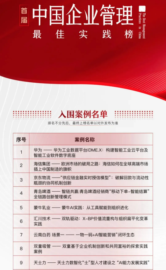 首屆「中國企業(yè)管理最佳實踐榜」由“中國管理模式50人+論壇”與《財經(jīng)》雜志聯(lián)合發(fā)起,旨在結(jié)合當(dāng)前時代下最受關(guān)注的管理命題,尤其將側(cè)重關(guān)注在“AI+管理”方面的具有引領(lǐng)性和開拓性的實踐,通過對基于場景的中國企業(yè)管理最佳實踐的挖掘和推廣,為企業(yè)推薦可借鑒、復(fù)制的解決方案,幫助企業(yè)少走彎路,實現(xiàn)價值增長,推動具有“技術(shù)理性與人文內(nèi)核”的中國方案走向世界。