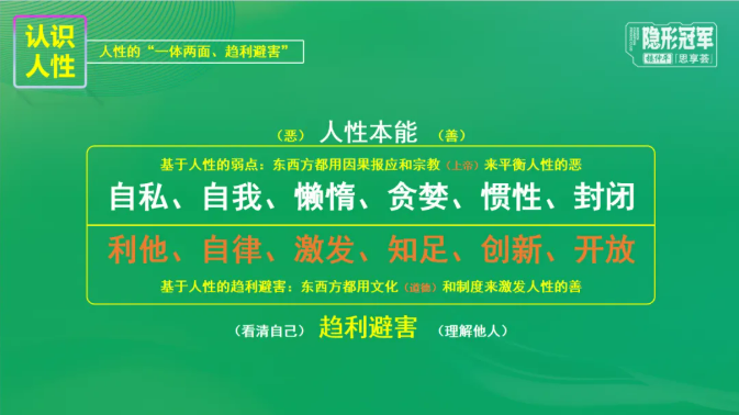但人性的真相是:所有的人性假設(shè)都不抵“人性本能”。所以要理解人性本能背后的貪婪、欲望、動機和行為失控而導(dǎo)致的緣起。理解一切看似非理性行為決策的背后的人性劣根性。