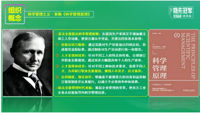 科學(xué)管理之父泰勒《科學(xué)管理原理》一書中,首次全面提出科學(xué)管理原則:在提高生產(chǎn)率而又不增加雇主和工人勞動量,使雙方都從中受益。這標(biāo)志全新管理時代的來臨。
