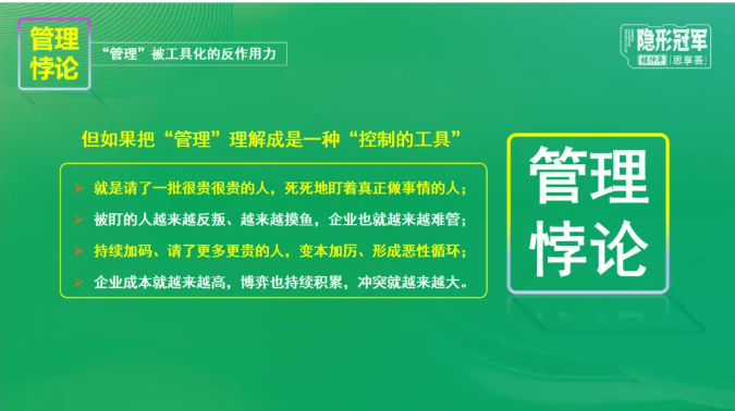 “管”與“理”組合,決定了組織“控制職能“和“協(xié)調(diào)職能”的兩大基本職能。然而,很多人會陷入到“管理悖論”,將其簡單理解為一種“控制的工具”。那么所謂“管理”何為正確?查爾斯·漢迪認為,管理其核心就是基于對人性的尊重。