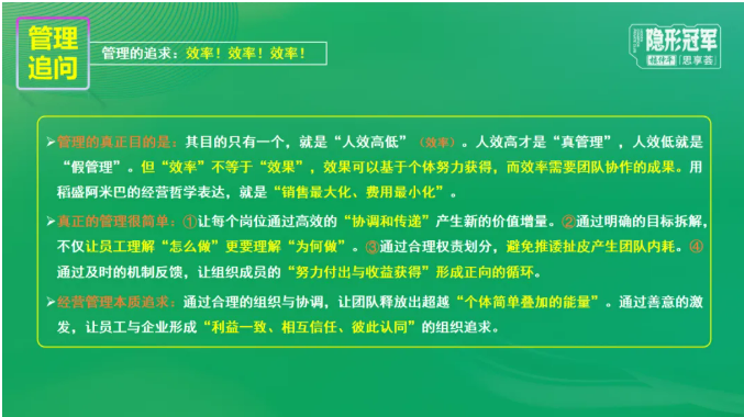 管理的真正目的是“人效高低”,但“效率”不等于“效果”,效果可以基于個體努力獲得,而效率是需要團隊共同協(xié)作的成果。