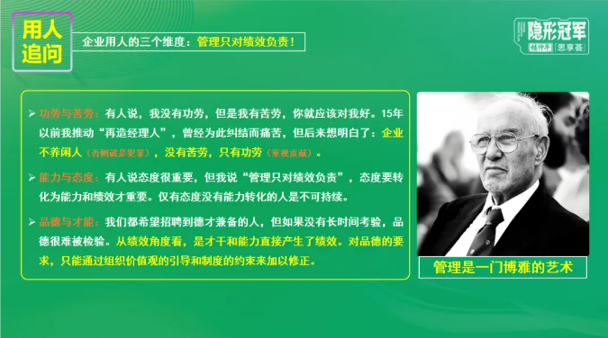 管理學(xué)者們都對用人有一些觀點傾向,而對于是“用人所長”還是“視人所短”,樓老師認為是“妥協(xié)大于平衡”,終極思考應(yīng)該是如何找到或培養(yǎng)更多“不需要管理的人”。