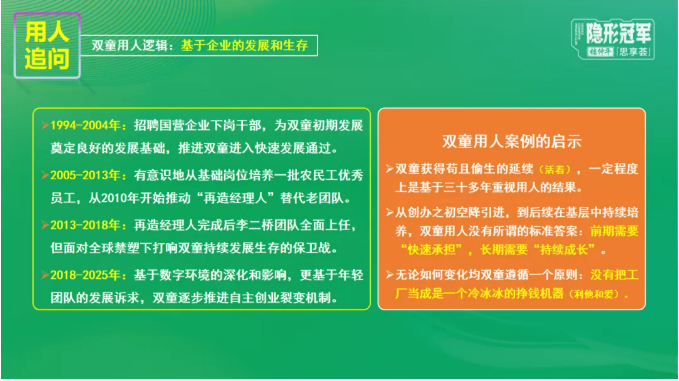 雙童的用人方式是從外部引進逐漸過渡到內(nèi)部培養(yǎng),其邏輯是基于企業(yè)的發(fā)展和生存而變化的。前期是需要“快速承擔(dān)”的,長期則更看重“持續(xù)成長”。