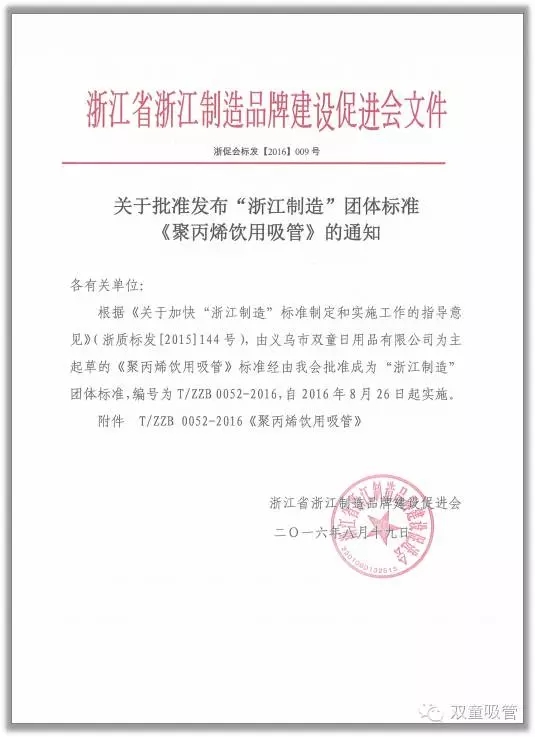 8月26日,“雙童”收到了浙江省浙江制造品牌建設促進會發(fā)出的通知,正式通知由“雙童”為主起草的“浙江制造”團體標準《聚丙烯飲用吸管》正式發(fā)布實施!