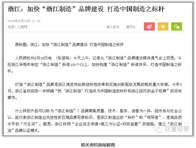 雖說“雙童”是吸管產品的行業(yè)標準、國家標準和ISO國際標準的第一起草編制單位,但得知“雙童”又作為主要起草編制單位編制的“浙江制造”《聚丙烯飲用吸管》標準正式發(fā)布,吸管妞還是很激動!因為這可不是簡單的區(qū)域標準!什么樣的產品可以稱為“浙江制造”?品牌需集質量、技術、服務、信譽為一體,經市場與社會公認,能代表浙江制造業(yè)先進性的區(qū)域品牌形象標識,是浙江制造業(yè)的“標桿”和“領導者”,是高品質水平的“代名詞”。