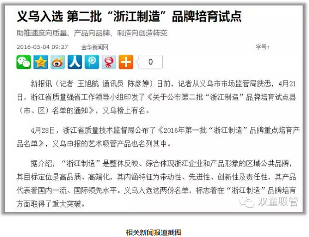 在2014年年底,浙江在全國率先以標準和認證為手段打造首個區(qū)域性公共品牌——“浙江制造”品牌。“浙江制造”標準比國家及行業(yè)標準要求要高,基本達到國際先進、國內一流水平。4月28日,浙江省質量技術監(jiān)督局公布《2016年第一批“浙江制造”品牌重點培育產品名單》,我們“雙童”代表義烏申報的吸管產品名列其中。入選這份名單,標志著義烏在“浙江制造”品牌培育方面取得了重大突破。