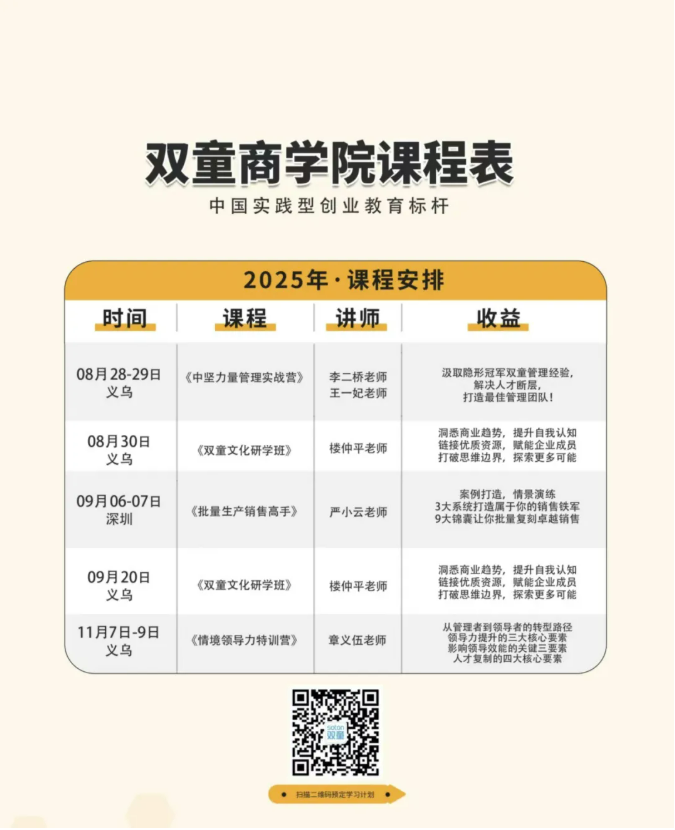 如果你也對(duì)“雙童”文化充滿(mǎn)好奇,也想賦能團(tuán)隊(duì)共同成長(zhǎng),歡迎走進(jìn)【雙童文化研學(xué)班】,與上百位優(yōu)秀的創(chuàng)業(yè)者一起學(xué)習(xí)!少量名額,歡迎咨詢(xún)鎖定!